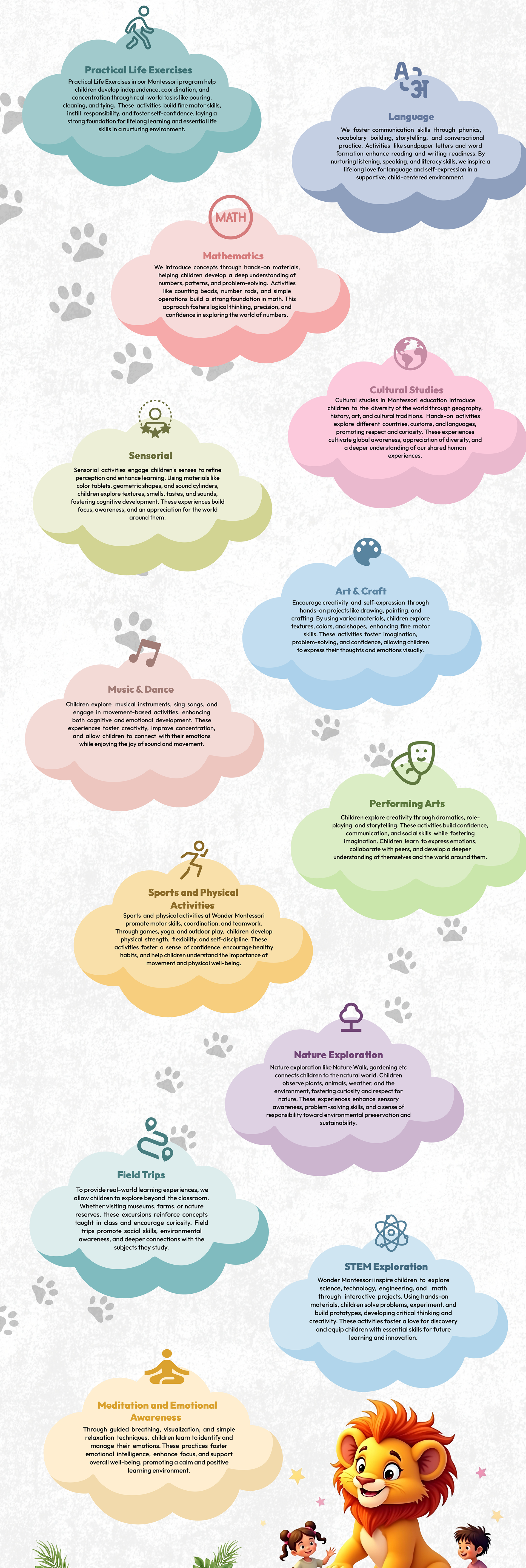 Our Vision is to cultivate a nurturing and inspiring learning environment where children develop a lifelong love for learning through a global network of Montessori schools and training centers that uphold excellence and innovation. Our school is guided by the principles of Dr. Maria Montessori, dedicated to respecting each child's unique potential, encouraging self-discovery, and instilling a deep sense of curiosity, responsibility, and empathy. By providing a prepared environment that provides a foundational gateway and promotes holistic development, we empower children to grow into confident, compassionate, and selfmotivated individuals who contribute positively to the world.